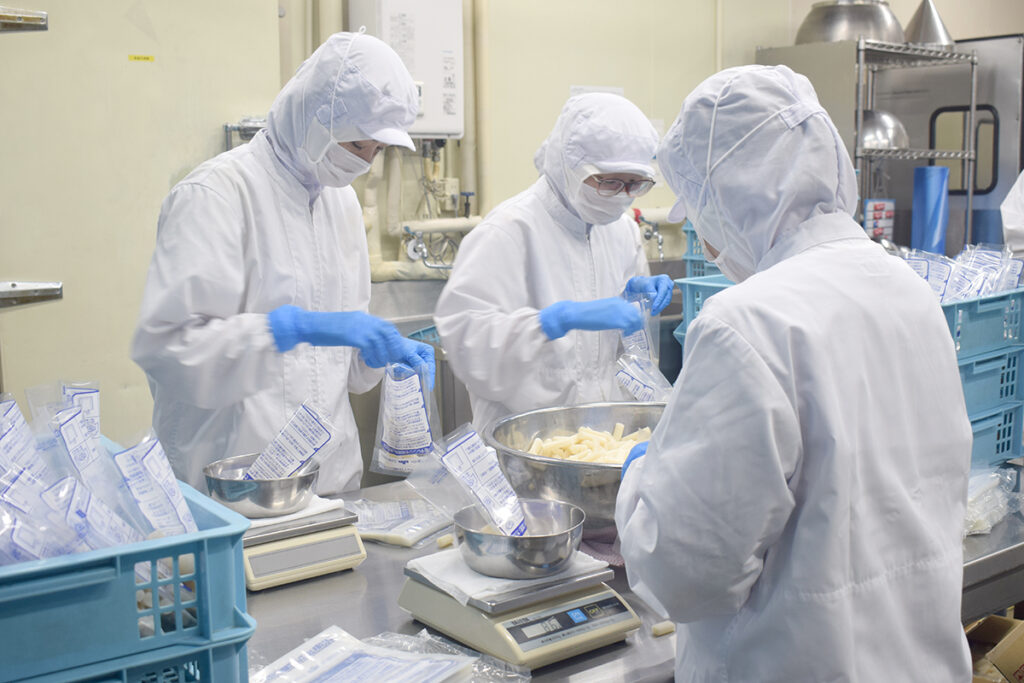 ソースをつくる人、生地を成形する人、具材を準備する人、焼き上げを担当する人、包装の最終工程を担う人。それぞれが自分の工程に責任を持ち、1つの商品のために力を合わせている。