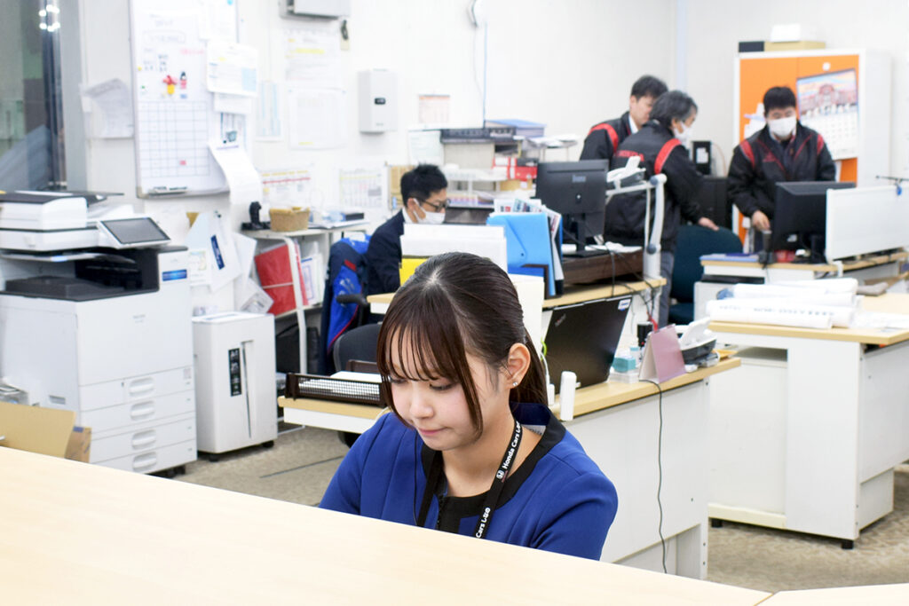 「店舗の装飾、来客対応、電話や問い合わせの対応、ご案内、カルテの整理、お会計や入金処理、自動車保険関連の事務など、本当にいろいろあります。ショールームの“顔”として最初にお客様と接するポジションなので、言葉遣いや笑顔は特に意識していますね」
